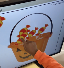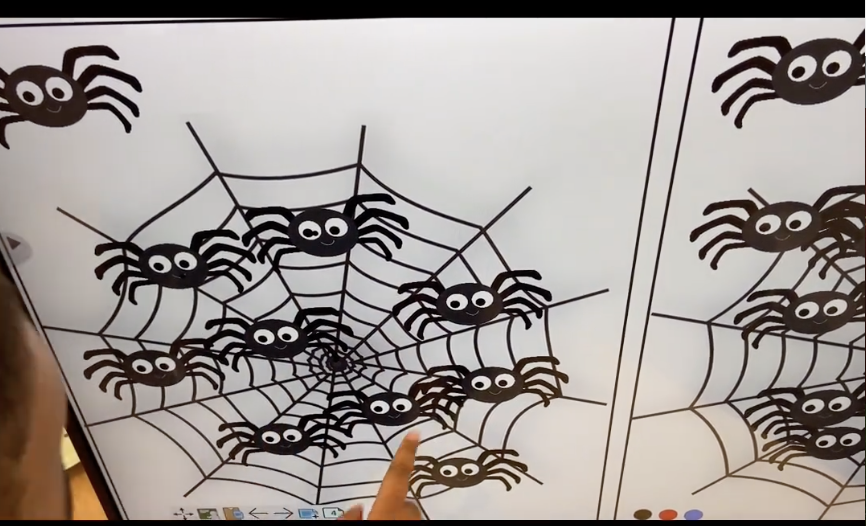 Petit atelier de dénombrement en duo ! Les élèves se mettent par 2. L’écran est divisé en deux cases avec au choix : des toiles d’araignées, des seaux citrouilles et des monstres.