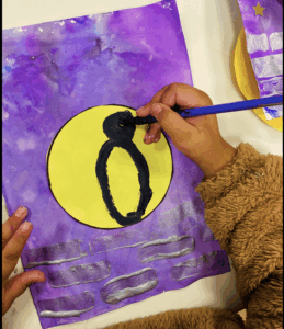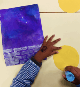 Étape 3 : coller la lune ( un rond jaune : papier coloré ) à ras du mur.