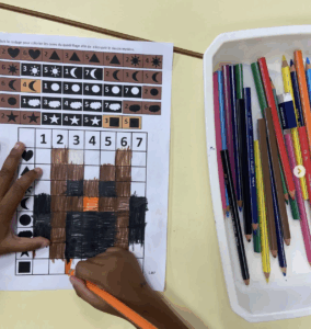 Il faut suivre le codage donné en légende en haut de la feuille et colorier la case indiquée en tenant compte de la couleur demandée. Pour s’aider on barre au fur et à mesure ce qu’on a fait dans la légende. Une fois fini on découvre le dessin mystère !