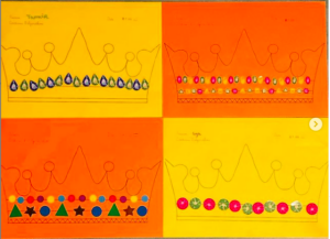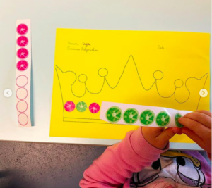 Je place à chaque fois quelques gommettes sur la ligne pour indiquer l’algorithme que l’enfant doit continuer en fonction du niveau de l’enfant on peut donc jouer sur les couleurs la quantité, les formes, les grandeurs …