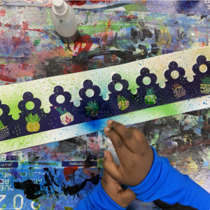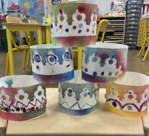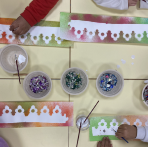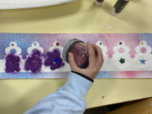 Étape 3 : je décore ma couronne : j’ajoute des paillettes, des sequins, des brillants avec de la colle blanche, du graphisme au feutre… chacun la personnalise comme il veut.