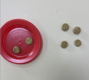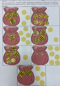 Étape 4 : on manipule avec les minis galette en pâte fimo avec le repère visuel puis sans le repère visuel. Possibilité de ne pas imprimer les supports et d’utiliser une assiette de la dinette de la classe par exemple comme sur la seconde photo.