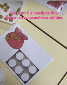 Étape 3 : de nouveau les diapos mais cette fois-ci sans le repère visuel des assiettes les enfants doivent trouver une autre stratégie ( en utilisant leurs doigts par exemple). On baisse le sac pour vérifier sa réponse.