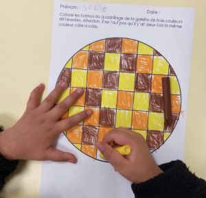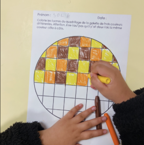 Le défi de la galette : colorie les cases du quadrillage de la galette avec 2 ou 3 couleurs différentes. Attention, il ne faut pas qu’il y ait deux fois la même couleur côte à côte.