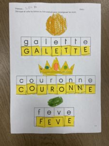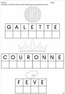 Recomposer les mots galette, couronne, fève en découpant et collant les lettres au bon endroit