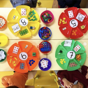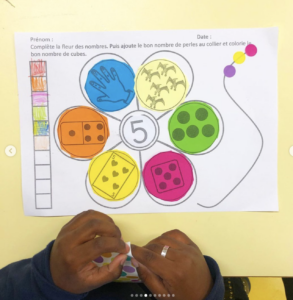 On choisit le chiffre ( soit le même pour tout le monde si on travaille un chiffre en particulier, soit au choix des enfants) et ils doivent remplir chaque pétale avec la quantité d’objet ou un objet représentant la quantité demandée ! Avec plein d’objets au choix ( domino, dés, numicon, animaux de tri, cartes, jetons …)