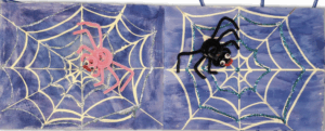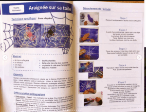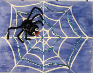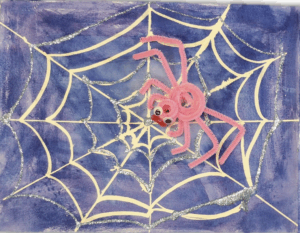 En résumé : Recouvrir la feuille d’encre effaçable, Laissez sécher. Avec un effaceur et une règle Tracer une étoile. Puis les courbes de la toile. Possibilité d’ajouter de la colle blanche et des paillettes. Araignée réalisée avec du fil Chenille et un pistolet à colle.