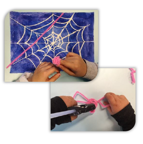 En résumé : Recouvrir la feuille d’encre effaçable, Laissez sécher. Avec un effaceur et une règle Tracer une étoile. Puis les courbes de la toile. Possibilité d’ajouter de la colle blanche et des paillettes. Araignée réalisée avec du fil Chenille et un pistolet à colle.