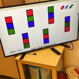 Étape 1 : explication des consignes sur mon écran @viewsonicfrance qui me sert de tableau. On tâtonne on cherche et on met des couleurs dans les carrés représentants les étages des tours.