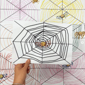 .Activité pas si évidente ! Les loulous choisissent une couleur de feutre et tracent des lignes obliques dans un des rayons de la toile.